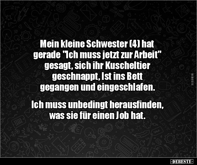 Mein kleine Schwester (4) hat gerade "Ich muss jetzt zur Arbeit" gesagt, sich ihr Kuscheltier geschnappt, Ist ins Bett gegangen und eingeschlafen. Ich muss unbedingt herausfinden, was sie für einen Job hat.