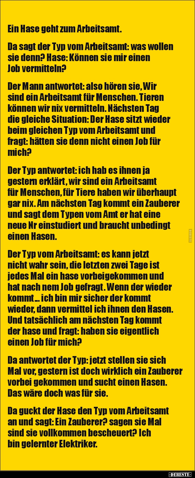 Ein Hase geht zum Arbeitsamt. Da sagt der Typ vom Arbeitsamt: was wollen sie denn? Hase: Können sie mir einen Job vermitteln? Der Mann antwortet: also hören sie, Wir sind ein Arbeitsamt für Menschen. Tieren können wir nix vermitteln. Nächsten Tag die gleiche Situation: Der Hase sitzt wieder beim gleichen Typ vom Arbeitsamt und fragt: hätten sie denn nicht einen Job für mich? Der Typ antwortet: ich hab es ihnen ja gestern erklärt, wir sind ein Arbeitsamt für Menschen, für Tiere haben wir überhaupt gar nix. Am nächsten Tag kommt ein Zauberer und sagt dem Typen vom Amt er hat eine neue Nr einstudiert und braucht unbedingt einen Hasen. Der Typ vom Arbeitsamt: es kann jetzt nicht wahr sein, die letzten zwei Tage ist jedes Mal ein hase vorbeigekommen und hat nach nem Job gefragt. Wenn der wieder kommt... ich bin mir sicher der kommt wieder, dann vermittel ich ihnen den Hasen. Und tatsächlich am nächsten Tag kommt der hase und fragt: haben sie eigentlich einen Job für mich? Da antwortet der Typ: jetzt stellen sie sich Mal vor, gestern ist doch wirklich ein Zauberer vorbei gekommen und sucht einen Hasen. Das wäre doch was für sie. Da guckt der Hase den Typ vom Arbeitsamt an und sagt: Ein Zauberer? sagen sie Mal sind sie vollkommen bescheuert? Ich bin gelernter Elektriker.