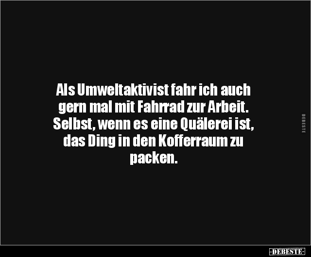 Als Umweltaktivist fahr ich auch gern mal mit Fahrrad zur Arbeit. Selbst, wenn es eine Quälerei ist, das Ding in den Kofferraum zu packen.