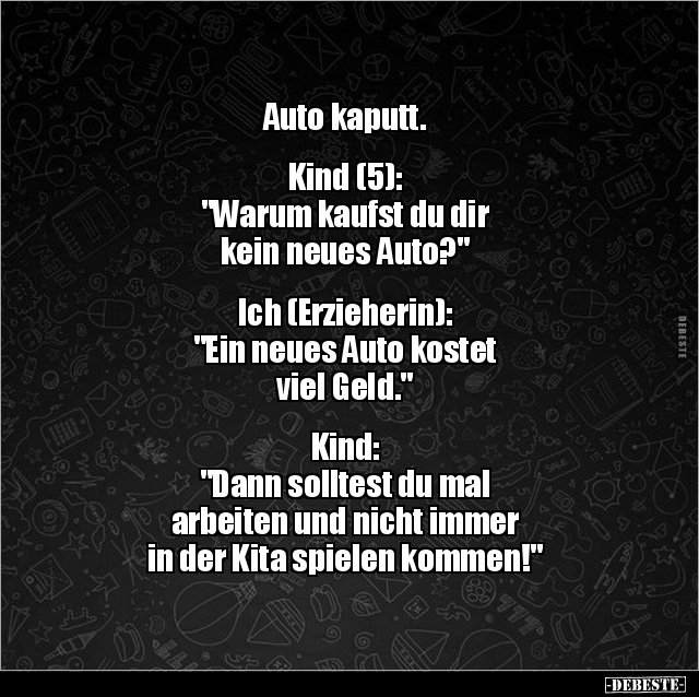 Auto kaputt. Kind (5): "Warum kaufst du dir kein neues Auto?" Ich (Erzieherin): "Ein neues Auto kostet viel Geld." Kind: "Dann solltest du mal arbeiten und nicht immer in der Kita spielen kommen!"
