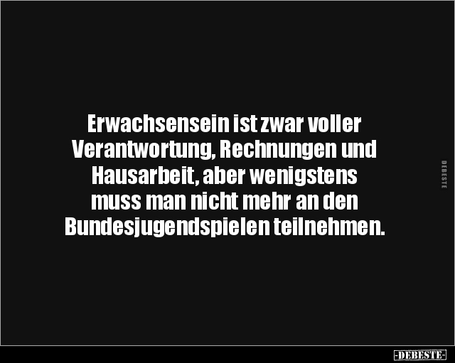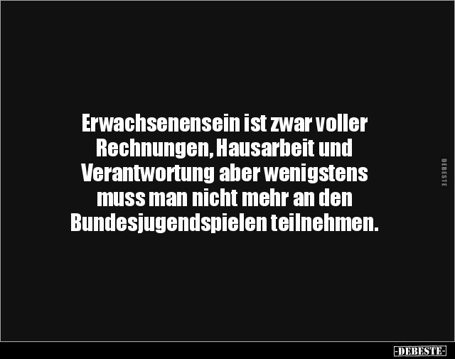 Erwachsenensein ist zwar voller Rechnungen, Hausarbeit und Verantwortung aber wenigstens muss man nicht mehr an den Bundesjugendspielen teilnehmen.