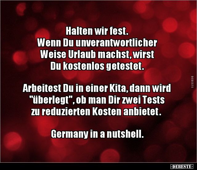 Halten wir fest. Wenn Du unverantwortlicher Weise Urlaub machst, wirst Du kostenlos getestet. Arbeitest Du in einer Kita, dann wird "überlegt", ob man Dir zwei Tests zu reduzierten Kosten anbietet. Germany in a nutshell.