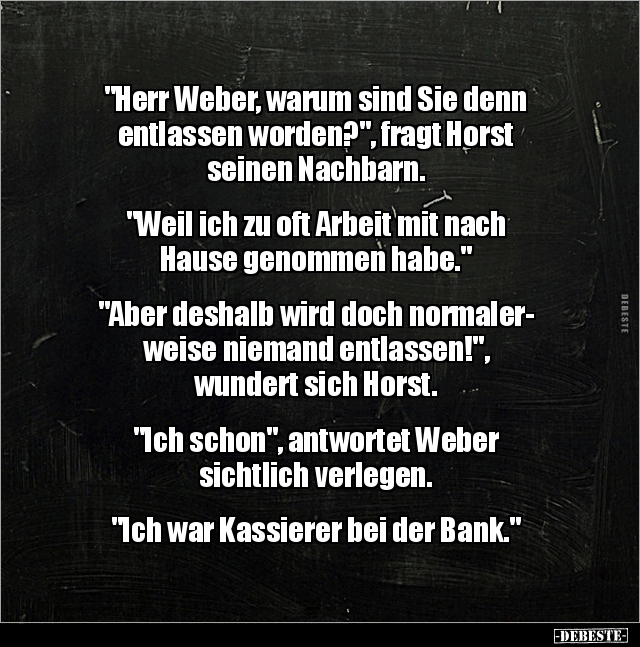 "Herr Weber, warum sind Sie denn entlassen worden?", fragt Horst seinen Nachbarn. "Weil ich zu oft Arbeit mit nach Hause genommen habe." "Aber deshalb wird doch normaler- weise niemand entlassen!", wundert sich Horst. "Ich schon", antwortet Weber sichtlich verlegen. "Ich war Kassierer bei der Bank."
