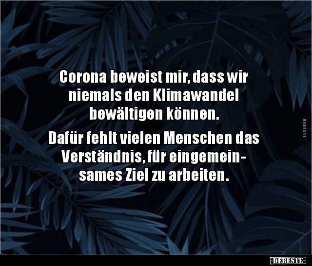 Corona beweist mir, dass wir niemals den Klimawandel bewältigen können. Dafür fehlt vielen Menschen das Verständnis, für eingemein- sames Ziel zu arbeiten.