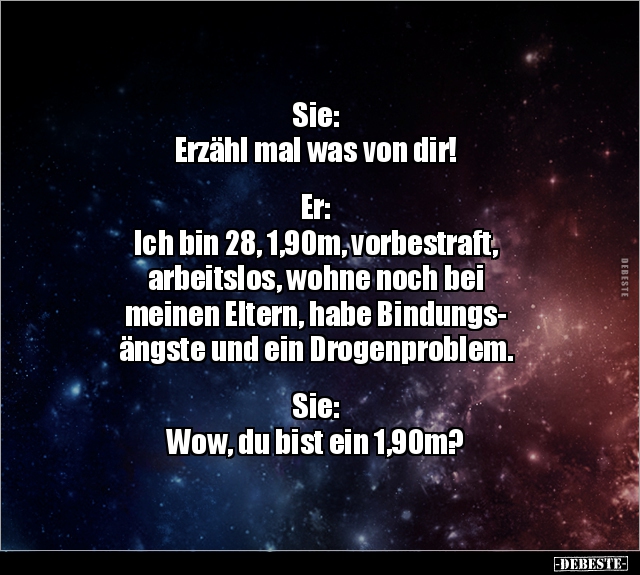 Sie: Erzähl mal was von dir! Er: Ich bin 28, 1,90m, vorbestraft, arbeitslos, wohne noch bei meinen Eltern, habe Bindungs- ängste und ein Drogenproblem. Sie: Wow, du bist ein 1,90m?