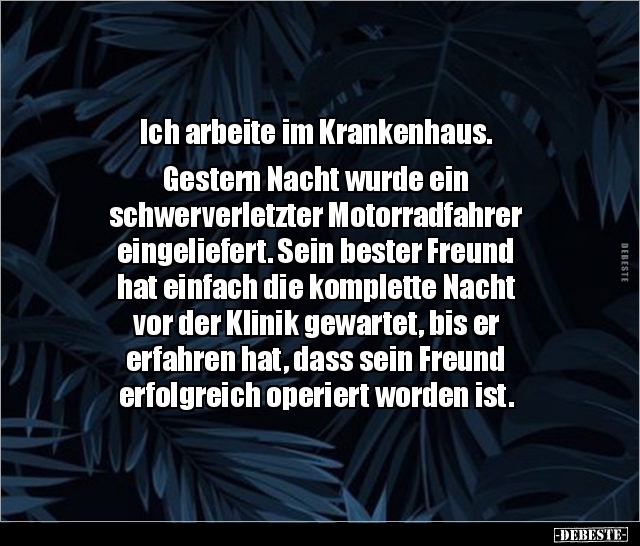 Ich arbeite im Krankenhaus. Gestern Nacht wurde ein schwerverletzter Motorradfahrer eingeliefert. Sein bester Freund hat einfach die komplette Nacht vor der Klinik gewartet, bis er erfahren hat, dass sein Freund erfolgreich operiert worden ist.