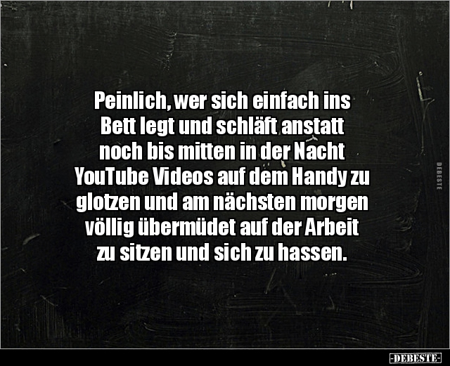 Peinlich, wer sich einfach ins Bett legt und schläft anstatt noch bis mitten in der Nacht YouTube Videos auf dem Handy zu glotzen und am nächsten morgen völlig übermüdet auf der Arbeit zu sitzen und sich zu hassen.