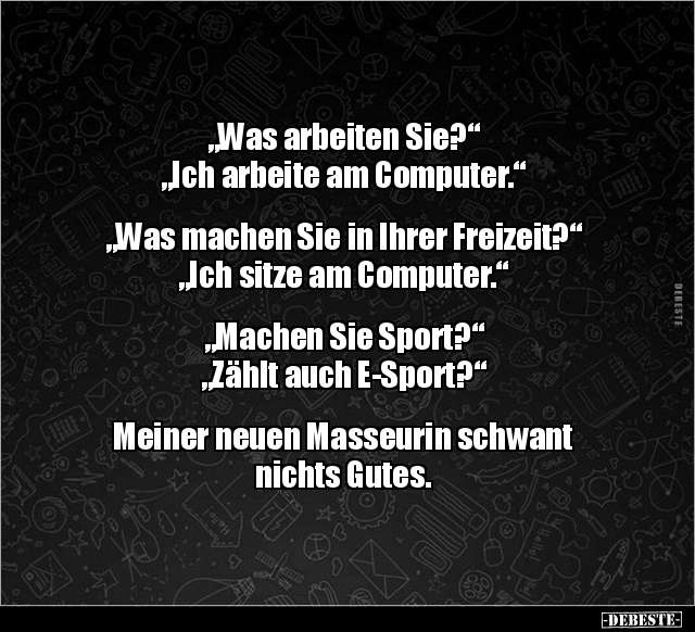 „Was arbeiten Sie?“ „Ich arbeite am Computer.“ „Was machen Sie in Ihrer Freizeit?“ „Ich sitze am Computer.“ „Machen Sie Sport?“ „Zählt auch E-Sport?“ Meiner neuen Masseurin schwant nichts Gutes.
