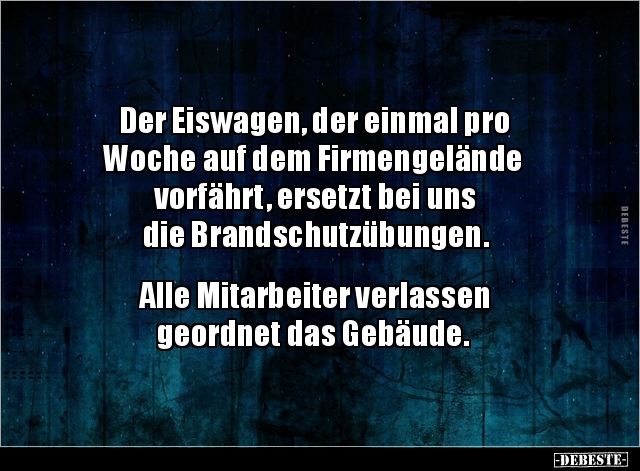 Der Eiswagen, der einmal pro Woche auf dem Firmengelände vorfährt, ersetzt bei uns die Brandschutzübungen. Alle Mitarbeiter verlassen geordnet das Gebäude.