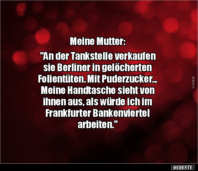 Meine Mutter: "An der Tankstelle verkaufen sie Berliner in gelöcherten Folientüten. Mit Puderzucker... Meine Handtasche sieht von ihnen aus, als würde ich im Frankfurter Bankenviertel arbeiten."