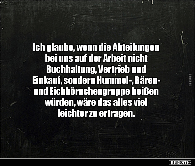 Ich glaube, wenn die Abteilungen bei uns auf der Arbeit nicht Buchhaltung, Vertrieb und Einkauf, sondern Hummel-, Bären- und Eichhörnchengruppe heißen würden, wäre das alles viel leichter zu ertragen.