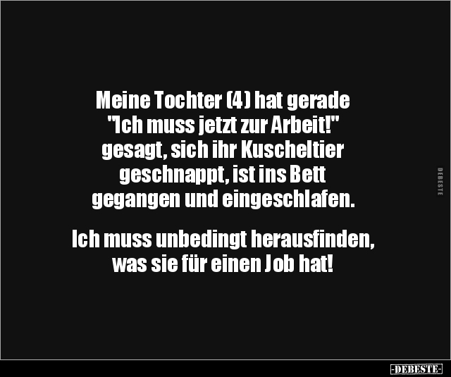 Meine Tochter (4) hat gerade "Ich muss jetzt zur Arbeit!" gesagt, sich ihr Kuscheltier geschnappt, ist ins Bett gegangen und eingeschlafen. Ich muss unbedingt herausfinden, was sie für einen Job hat!