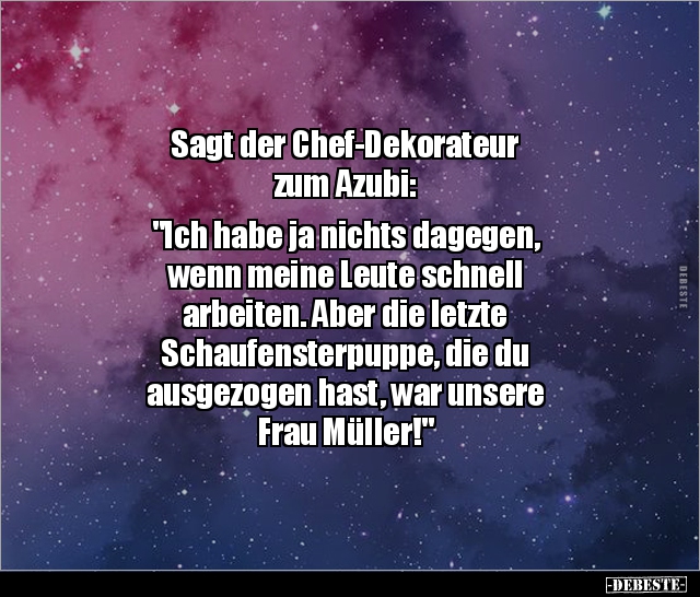 Sagt der Chef-Dekorateur zum Azubi: "Ich habe ja nichts dagegen, wenn meine Leute schnell arbeiten. Aber die letzte Schaufensterpuppe, die du ausgezogen hast, war unsere Frau Müller!"