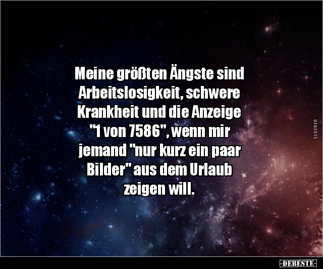 Meine größten Ängste sind Arbeitslosigkeit, schwere Krankheit und die Anzeige "1 von 7586", wenn mir jemand "nur kurz ein paar Bilder" aus dem Urlaub zeigen will.