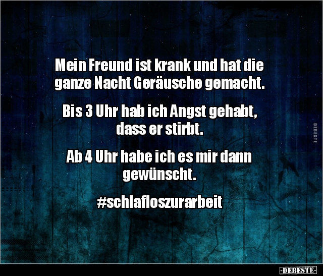 Mein Freund ist krank und hat die ganze Nacht Geräusche gemacht. Bis 3 Uhr hab ich Angst gehabt, dass er stirbt. Ab 4 Uhr habe ich es mir dann gewünscht. #schlafloszurarbeit