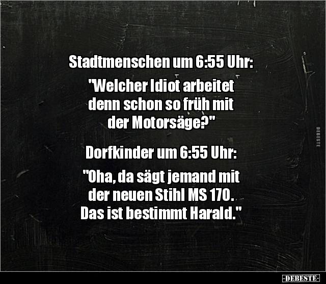 Stadtmenschen um 6:55 Uhr: "Welcher Idiot arbeitet denn schon so früh mit der Motorsäge?" Dorfkinder um 6:55 Uhr: "Oha, da sägt jemand mit der neuen Stihl MS 170. Das ist bestimmt Harald."