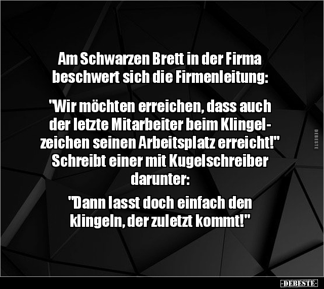 Am Schwarzen Brett in der Firma beschwert sich die Firmenleitung: "Wir möchten erreichen, dass auch der letzte Mitarbeiter beim Klingel- zeichen seinen Arbeitsplatz erreicht!" Schreibt einer mit Kugelschreiber darunter: "Dann lasst doch einfach den klingeln, der zuletzt kommt!"