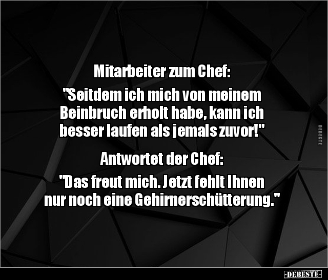 Mitarbeiter zum Chef: "Seitdem ich mich von meinem Beinbruch erholt habe, kann ich besser laufen als jemals zuvor!" Antwortet der Chef: "Das freut mich. Jetzt fehlt Ihnen nur noch eine Gehirnerschütterung."