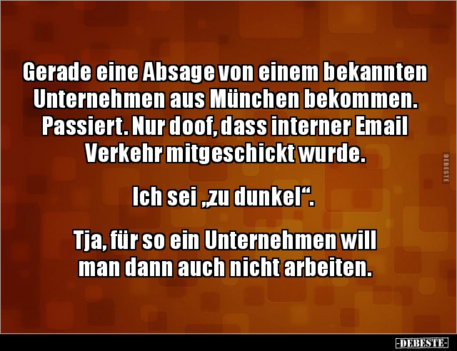 Gerade eine Absage von einem bekannten Unternehmen aus München bekommen. Passiert. Nur doof, dass interner Email Verkehr mitgeschickt wurde. Ich sei „zu dunkel“. Tja, für so ein Unternehmen will man dann auch nicht arbeiten.