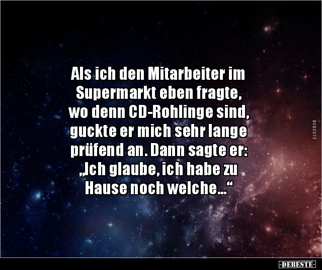 Als ich den Mitarbeiter im Supermarkt eben fragte, wo denn CD-Rohlinge sind, guckte er mich sehr lange prüfend an. Dann sagte er: „Ich glaube, ich habe zu Hause noch welche...“