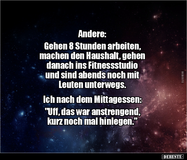 Andere: Gehen 8 Stunden arbeiten, machen den Haushalt, gehen danach ins Fitnessstudio und sind abends noch mit Leuten unterwegs. Ich nach dem Mittagessen: "Uff, das war anstrengend, kurz noch mal hinlegen."