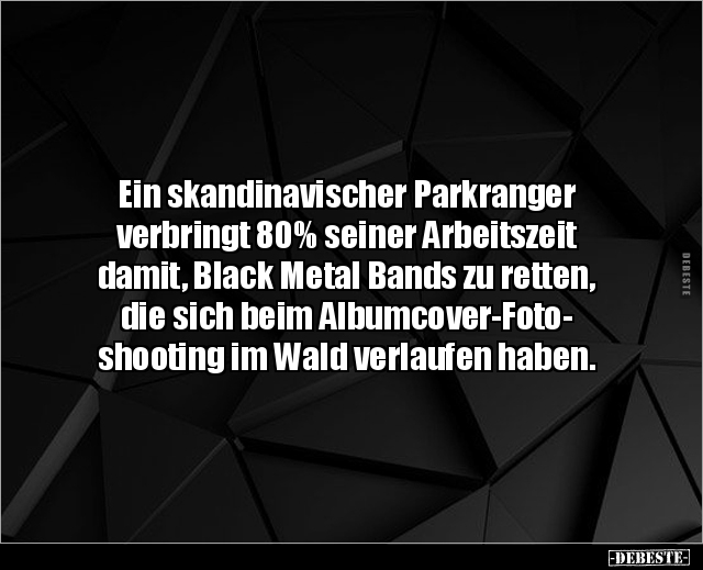Ein skandinavischer Parkranger verbringt 80% seiner Arbeitszeit damit, Black Metal Bands zu retten, die sich beim Albumcover-Foto- shooting im Wald verlaufen haben.