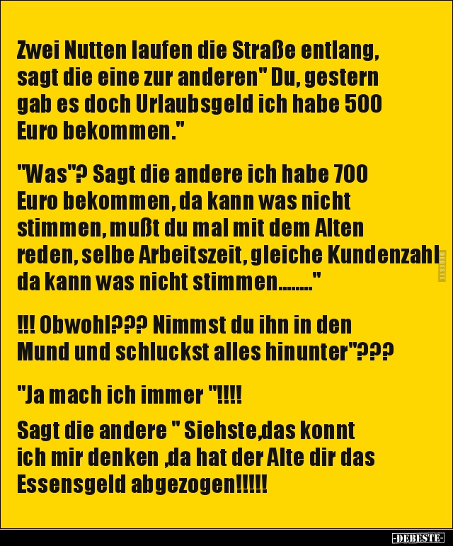 Zwei Nutten laufen die Straße entlang, sagt die eine zur anderen" Du, gestern gab es doch Urlaubsgeld ich habe 500 Euro bekommen." "Was"? Sagt die andere ich habe 700 Euro bekommen, da kann was nicht stimmen, mußt du mal mit dem Alten reden, selbe Arbeitszeit, gleiche Kundenzahl da kann was nicht stimmen........" !!! Obwohl??? Nimmst du ihn in den Mund und schluckst alles hinunter"??? "Ja mach ich immer "!!!! Sagt die andere " Siehste,das konnt ich mir denken ,da hat der Alte dir das Essensgeld abgezogen!!!!!