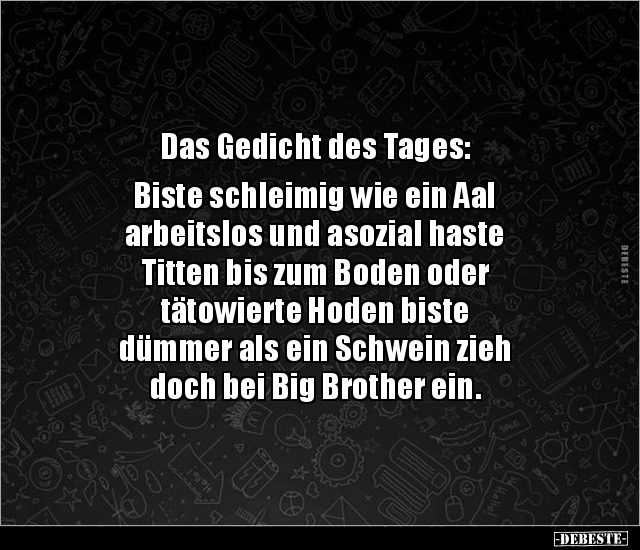 Das Gedicht des Tages: Biste schleimig wie ein Aal arbeitslos und asozial haste Titten bis zum Boden oder tätowierte Hoden biste dümmer als ein Schwein zieh doch bei Big Brother ein.