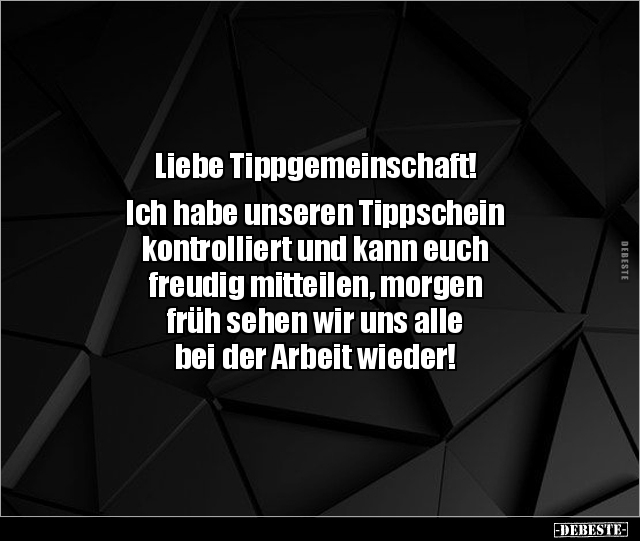 Liebe Tippgemeinschaft! Ich habe unseren Tippschein kontrolliert und kann euch freudig mitteilen, morgen früh sehen wir uns alle bei der Arbeit wieder!