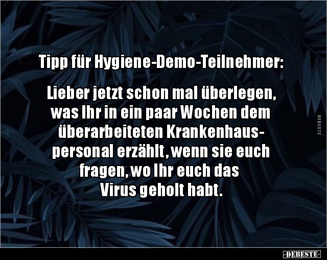 Tipp für Hygiene-Demo-Teilnehmer: Lieber jetzt schon mal überlegen, was Ihr in ein paar Wochen dem überarbeiteten Krankenhaus- personal erzählt, wenn sie euch fragen, wo Ihr euch das Virus geholt habt.
