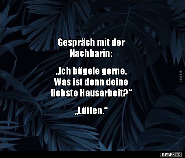 Gespräch mit der Nachbarin: „Ich bügele gerne. Was ist denn deine liebste Hausarbeit?“ „Lüften.“