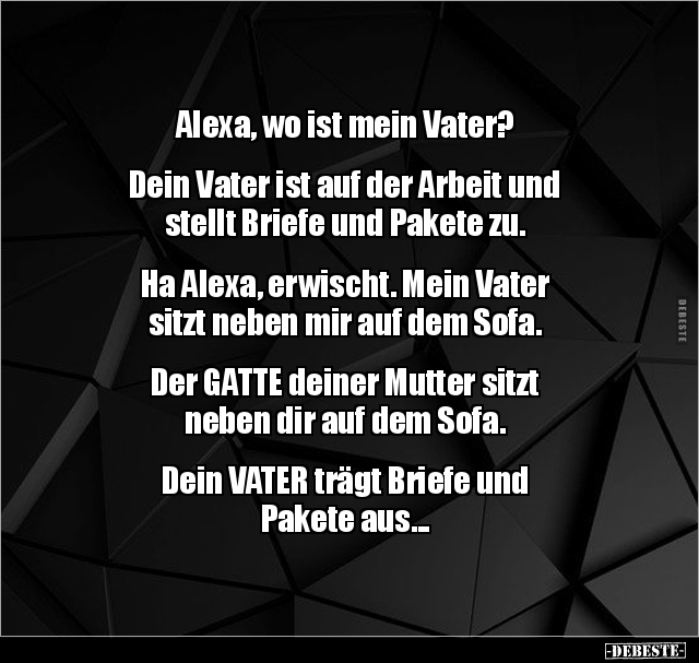 Alexa, wo ist mein Vater? Dein Vater ist auf der Arbeit und stellt Briefe und Pakete zu. Ha Alexa, erwischt. Mein Vater sitzt neben mir auf dem Sofa. Der GATTE deiner Mutter sitzt neben dir auf dem Sofa. Dein VATER trägt Briefe und Pakete aus...