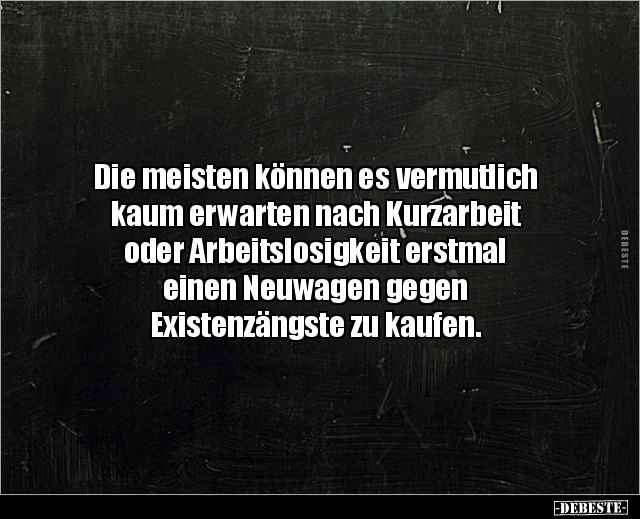 Die meisten können es vermutlich kaum erwarten nach Kurzarbeit oder Arbeitslosigkeit erstmal einen Neuwagen gegen Existenzängste zu kaufen.