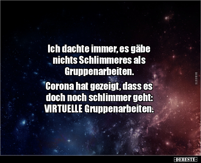 Ich dachte immer, es gäbe nichts Schlimmeres als Gruppenarbeiten. Corona hat gezeigt, dass es doch noch schlimmer geht: VIRTUELLE Gruppenarbeiten.