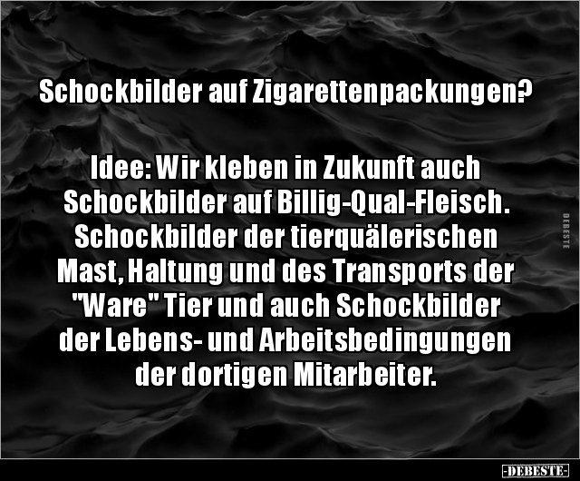 Schockbilder auf Zigarettenpackungen? Idee: Wir kleben in Zukunft auch Schockbilder auf Billig-Qual-Fleisch. Schockbilder der tierquälerischen Mast, Haltung und des Transports der "Ware" Tier und auch Schockbilder der Lebens- und Arbeitsbedingungen der dortigen Mitarbeiter.