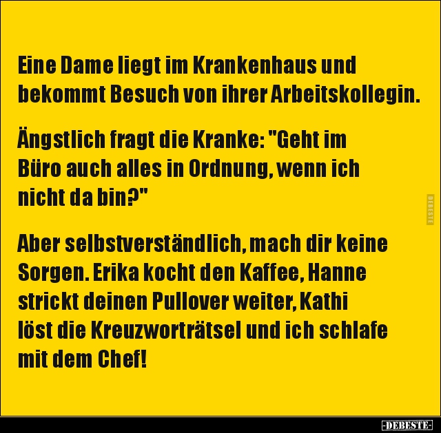 Eine Dame liegt im Krankenhaus und bekommt Besuch von ihrer Arbeitskollegin. Ängstlich fragt die Kranke: "Geht im Büro auch alles in Ordnung, wenn ich nicht da bin?" Aber selbstverständlich, mach dir keine Sorgen. Erika kocht den Kaffee, Hanne strickt deinen Pullover weiter, Kathi löst die Kreuzworträtsel und ich schlafe mit dem Chef!