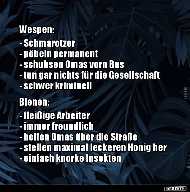 Wespen: - Schmarotzer - pöbeln permanent - schubsen Omas vorn Bus - tun gar nichts für die Gesellschaft - schwer kriminell Bienen: - fleißige Arbeiter - immer freundlich - helfen Omas über die Straße - stellen maximal leckeren Honig her - einfach knorke Insekten