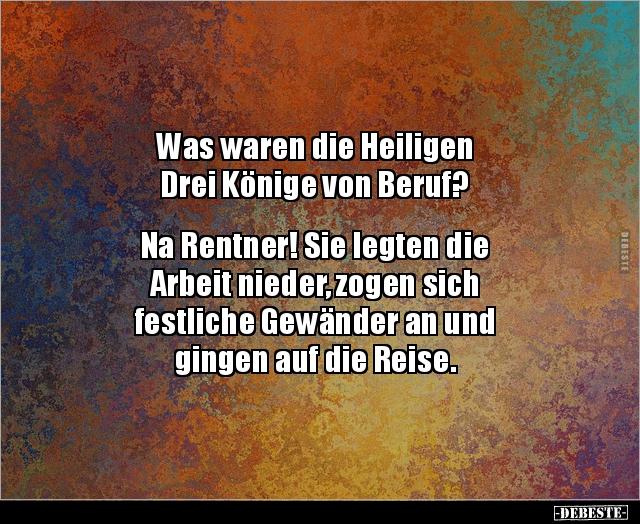 Was waren die Heiligen Drei Könige von Beruf? Na Rentner! Sie legten die Arbeit nieder, zogen sich festliche Gewänder an und gingen auf die Reise.