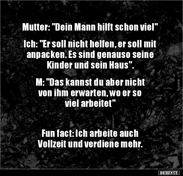 Mutter: "Dein Mann hilft schon viel" Ich: "Er soll nicht helfen, er soll mit anpacken. Es sind genauso seine Kinder und sein Haus". M: "Das kannst du aber nicht von ihm erwarten, wo er so viel arbeitet" Fun fact: Ich arbeite auch Vollzeit und verdiene mehr.