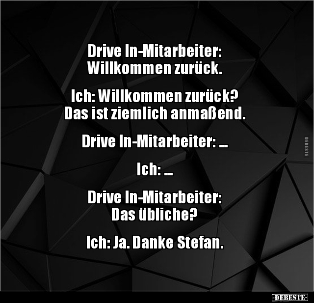 Drive In-Mitarbeiter: Willkommen zurück. Ich: Willkommen zurück? Das ist ziemlich anmaßend. Drive In-Mitarbeiter: ... Ich: ... Drive In-Mitarbeiter: Das übliche? Ich: Ja. Danke Stefan.