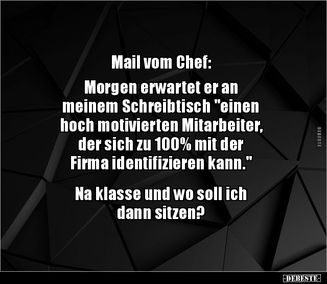 Mail vom Chef: Morgen erwartet er an meinem Schreibtisch "einen hoch motivierten Mitarbeiter, der sich zu 100% mit der Firma identifizieren kann." Na klasse und wo soll ich dann sitzen?