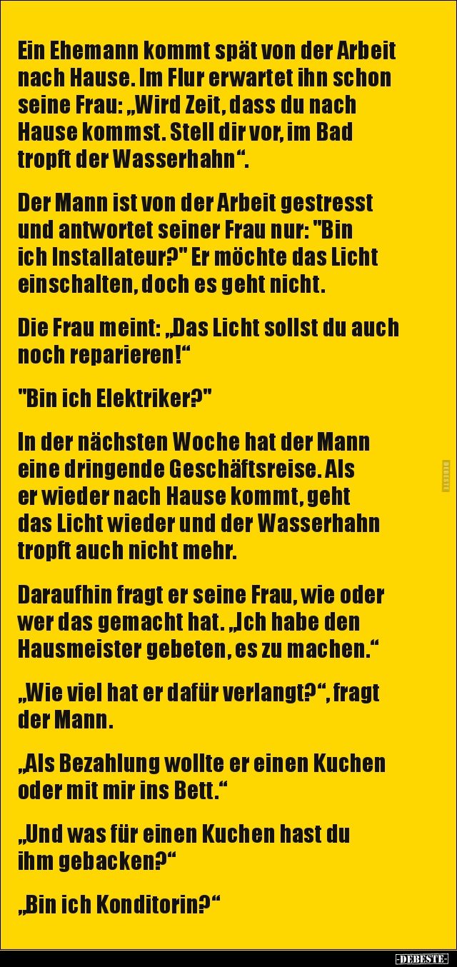 Ein Ehemann kommt spät von der Arbeit nach Hause. Im Flur erwartet ihn schon seine Frau: „Wird Zeit, dass du nach Hause kommst. Stell dir vor, im Bad tropft der Wasserhahn“. Der Mann ist von der Arbeit gestresst und antwortet seiner Frau nur: "Bin ich Installateur?" Er möchte das Licht einschalten, doch es geht nicht. Die Frau meint: „Das Licht sollst du auch noch reparieren!“ "Bin ich Elektriker?" In der nächsten Woche hat der Mann eine dringende Geschäftsreise. Als er wieder nach Hause kommt, geht das Licht wieder und der Wasserhahn tropft auch nicht mehr. Daraufhin fragt er seine Frau, wie oder wer das gemacht hat. „Ich habe den Hausmeister gebeten, es zu machen.“ „Wie viel hat er dafür verlangt?“, fragt der Mann. „Als Bezahlung wollte er einen Kuchen oder mit mir ins Bett.“ „Und was für einen Kuchen hast du ihm gebacken?“ „Bin ich Konditorin?“