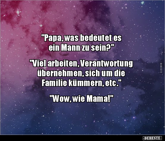 "Papa, was bedeutet es ein Mann zu sein?" "Viel arbeiten, Verantwortung übernehmen, sich um die Familie kümmern, etc." "Wow, wie Mama!"