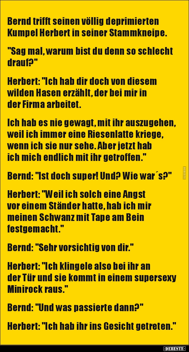 Bernd trifft seinen völlig deprimierten Kumpel Herbert in seiner Stammkneipe. "Sag mal, warum bist du denn so schlecht drauf?" Herbert: "Ich hab dir doch von diesem wilden Hasen erzählt, der bei mir in der Firma arbeitet. Ich hab es nie gewagt, mit ihr auszugehen, weil ich immer eine Riesenlatte kriege, wenn ich sie nur sehe. Aber jetzt hab ich mich endlich mit ihr getroffen." Bernd: "Ist doch super! Und? Wie war´s?" Herbert: "Weil ich solch eine Angst vor einem Ständer hatte, hab ich mir meinen Schwanz mit Tape am Bein festgemacht." Bernd: "Sehr vorsichtig von dir." Herbert: "Ich klingele also bei ihr an der Tür und sie kommt in einem supersexy Minirock raus." Bernd: "Und was passierte dann?" Herbert: "Ich hab ihr ins Gesicht getreten."