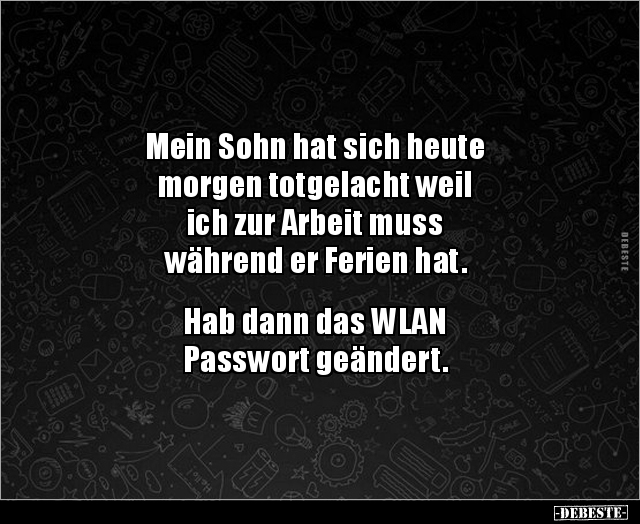 Mein Sohn hat sich heute morgen totgelacht weil ich zur Arbeit muss während er Ferien hat. Hab dann das WLAN Passwort geändert.