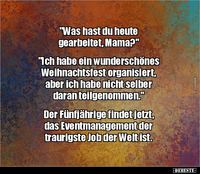 "Was hast du heute gearbeitet, Mama?" "Ich habe ein wunderschönes Weihnachtsfest organisiert, aber ich habe nicht selber daran teilgenommen." Der Fünfjährige findet jetzt, das Eventmanagement der traurigste Job der Welt ist.