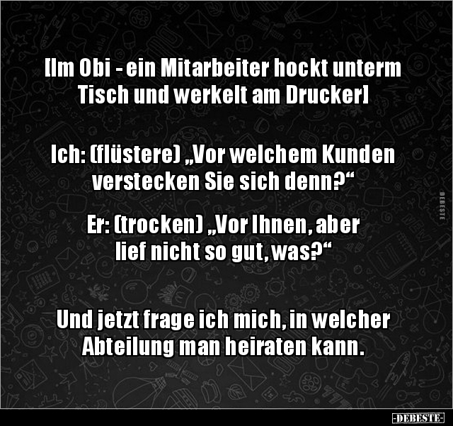 [Im Obi - ein Mitarbeiter hockt unterm Tisch und werkelt am Drucker] Ich: (flüstere) „Vor welchem Kunden verstecken Sie sich denn?“ Er: (trocken) „Vor Ihnen, aber lief nicht so gut, was?“ Und jetzt frage ich mich, in welcher Abteilung man heiraten kann.