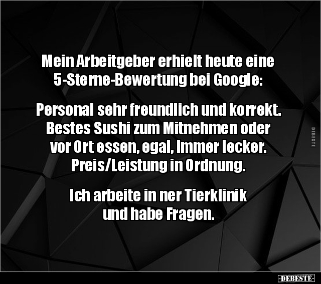 Mein Arbeitgeber erhielt heute eine 5-Sterne-Bewertung bei Google: Personal sehr freundlich und korrekt. Bestes Sushi zum Mitnehmen oder vor Ort essen, egal, immer lecker. Preis/Leistung in Ordnung. Ich arbeite in ner Tierklinik und habe Fragen.