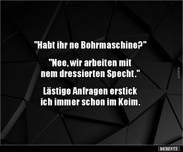 "Habt ihr ne Bohrmaschine?" "Nee, wir arbeiten mit nem dressierten Specht." Lästige Anfragen erstick ich immer schon im Keim.
