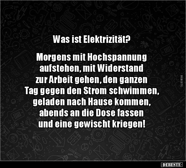 Was ist Elektrizität? Morgens mit Hochspannung aufstehen, mit Widerstand zur Arbeit gehen, den ganzen Tag gegen den Strom schwimmen, geladen nach Hause kommen, abends an die Dose fassen und eine gewischt kriegen!